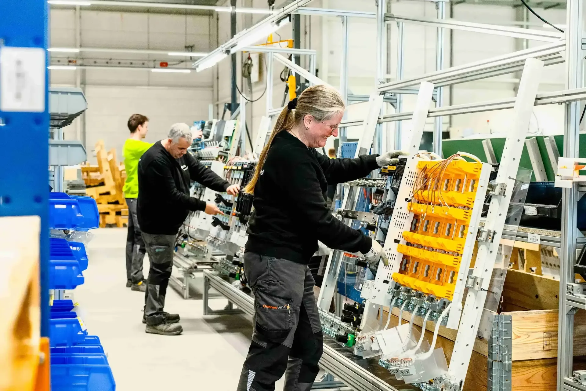 Voor de assemblage is een specifieke productielijn ontwikkeld: een efficiënte, seriematige lijn die is ingericht op hoge snelheid en continuïteit. De lijn bestaat uit meerdere werkstations waar halffabricaten stapsgewijs worden geassembleerd tot een compleet eindproduct. Monteurs zijn als eindgebruiker actief betrokken bij de ontwikkeling. Er is nadrukkelijk gekeken naar ergonomie en gebruiksgemak. Hoe kunnen zij straks alles eenvoudig aansluiten, beheren en onderhouden? We willen het werk voor hen zo prettig en efficiënt mogelijk maken.